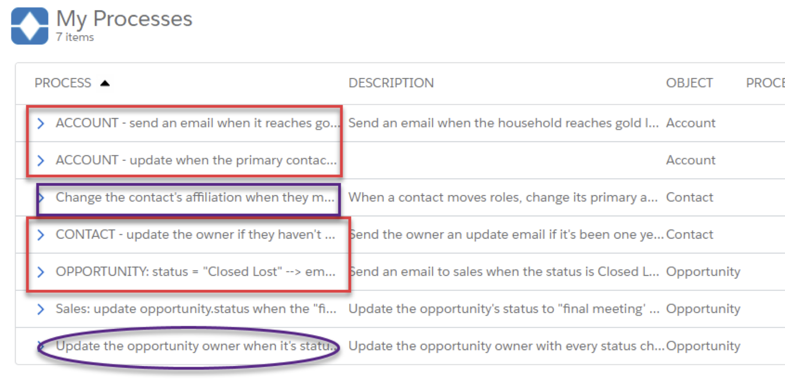 This is a version of something that I’ve seen in real life and may be familiar to you. Whenever someone creates a process, they use their own, different, naming convention. Every time I go in to update a process, I have to read through all the names to find the one I’m looking for, instead of the design facilitating that search.