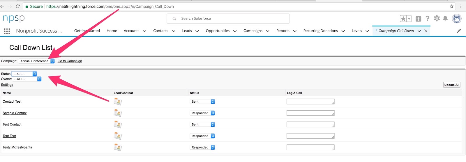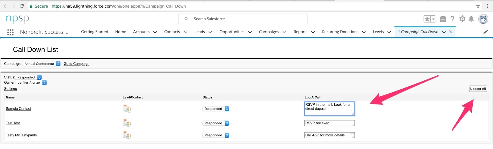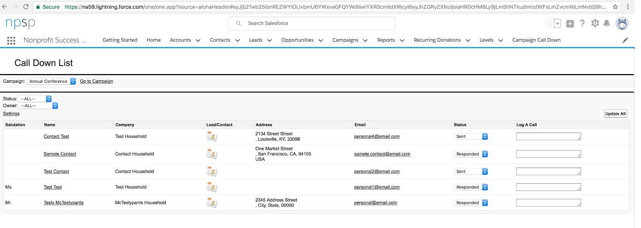 This neat one page app allows users to skip clicking back and forth between Leads and Contacts and campaigns. In this example I am pretending that my Campaign is an annual conference and I’m keeping track of who has responded to invitations.