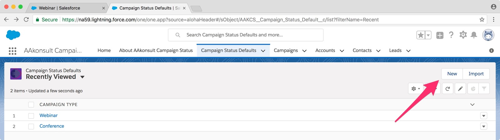 Now I’m ready to begin using the Campaign Status Default App. I navigate to the app and go to the Campaign Status Defaults tab.