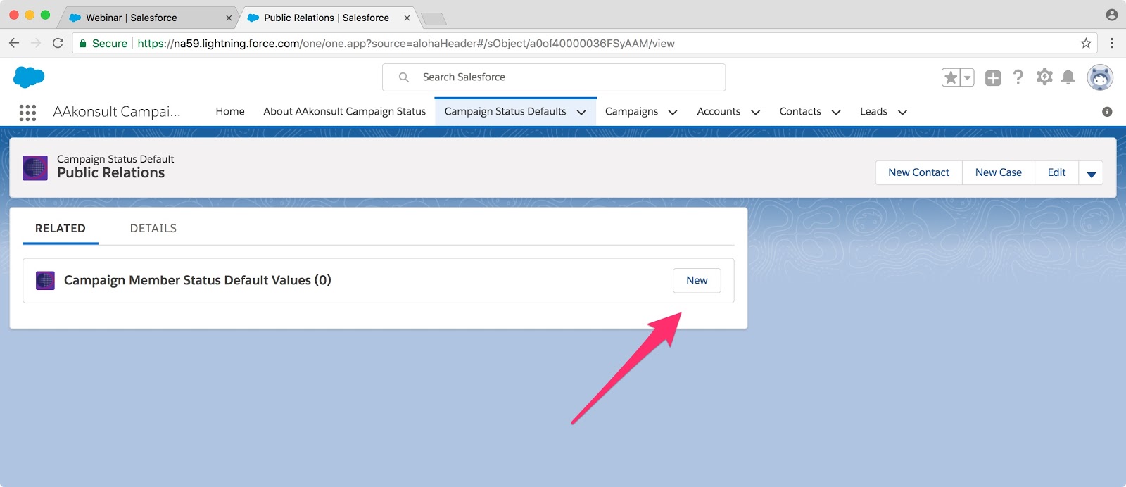 Once you download the app, you navigate to it via the app launcher. Then choose the Campaign Status Defaults tab. I am pretending that I am setting up a campaign for an annual cocktail party that my organization throws for its press contacts each year. It’s a Public Relations type and I have four possible Campaign Member Statuses set up: Invited (this is my default), Responded Yes, Cancelled, and Attended. I set these up in my Campaign Member picklist.