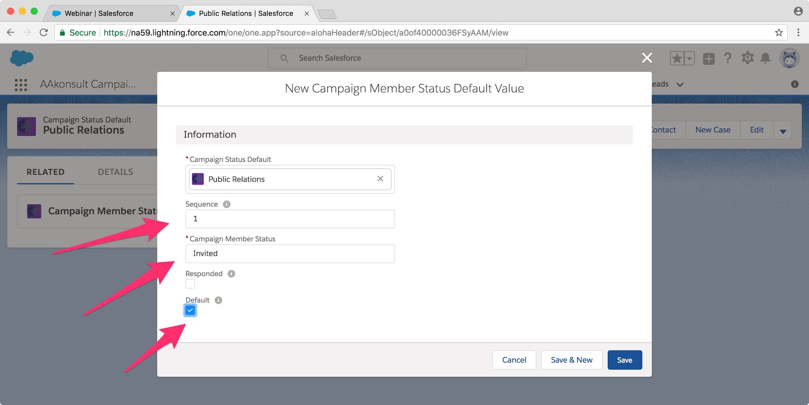 Enter the sequence. In this case, I chose “1” as I want the default set to the first interaction I have with my Campaign Members. Then choose the status you want to set as the default. (I previously set up “Invited” as a possible choice in my Campaign Member Status picklist.) Finally tick the “Default” checkbox.