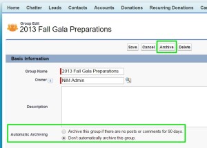First, review all active Chatter groups and Archive those that are not actively used. You can do this by opening up a group’s settings and clicking the Archive button.
