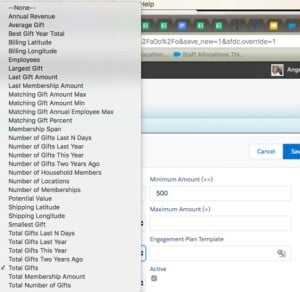 Now, with NPSP Levels, development staff can easily set up Levels based on Minimum or Maximum Amounts for a variety of fields (see below) on the Account, Contact, or custom objects.